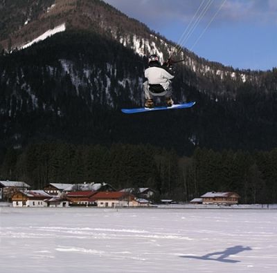 Snowkiten (Snowkiting) ist die coolste Art, sich im Schnee fortzubewegen: Auf Snowboard oder Ski lässt man sich von einem Powerkite, einem ca. 10qm großen Zugdrachen an 20 m langen Leinen, per Windkraft über verschneite Wiesen oder zugefrorene Seen ziehen. Bei besonders günstigen Bedingungen ist es sogar möglich, bergauf zu fahren!