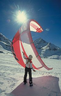 Endlos weit glitzert der Schnee. Am Horizont erheben sich die winterweißen Hänge und Gipfel der Alpen. Keine Menschenseele weit und breit. Ein stetiger Wind erfrischt deine Lungen. Ski oder Snowboard angeschnallt, der Kite erhebt sich in die Luft, ein Ruck, und du rast los. Du ziehst einen weiten Turn in die unberührte Schneefläche, der aufstiebende Powder glitzert haushoch im Gegenlicht der Bergsonne. Du gehst hart an den Wind, dein Board pflügt mit Highspeed durch den Pulver. Da, ein kleiner Hügel, das ist dein Kicker, du hebst ab. Sekundenlang schwebst du schwerelos über der verschneiten Landschaft. Ein Schrei des Glücks entfährt deiner Brust. Du bist frei!